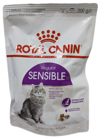 Royal Canin Sensible — сухой корм для взрослых кошек (в возрасте от 1 года до 7 лет) с повышенной чувствительностью пищеварительной системы. Сочетание крокет трех разных форм и эксклюзивный комплекс ароматов обеспечат привлекательность продукта для кошек с пониженным аппетитом и чувствительной пищеварительной системой. Повышенная чувствительность пищеварительной системы некоторых кошек приводит к возникновению жидкого стула. Корм Sensible 33 содержит эксклюзивное сочетание нутриентов (L.I.P. — специально отобранные белки с высокой степенью усвояемости), помогающих избежать проблем с пищеварением, и пребиотики, обеспечивающие баланс кишечной флоры. Три различные формы крокет и тщательно подобранные ароматические добавки стимулируют аппетит у кошек с повышенной чувствительностью пищеварительной системы. Для кошек, нуждающихся в высококалорийном питании. Высокая калорийность корма позволяет уменьшить объем потребляемой пищи и понизить нагрузку на пищеварительную систему кошек с повышенной чувствительностью. Разработан для поддержания здоровья мочевыделительной системы у взрослых кошек.