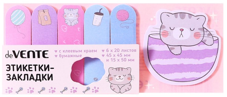 Закладки-разделители бумажные с липким краем deVente, 6 блоков×20 л. (45×45 мм и 15×50 мм), Black&White Cat