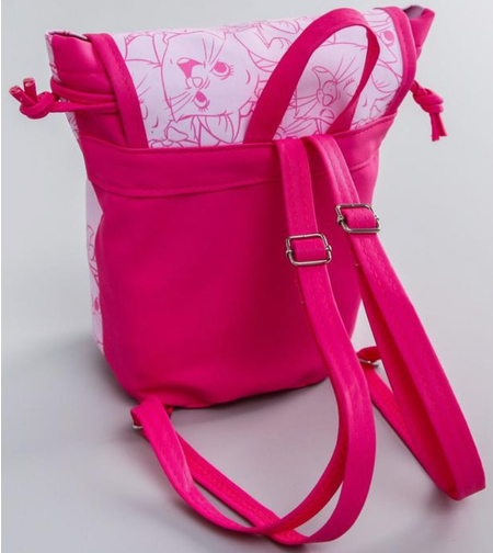 Небольшой рюкзачок для девочки. Изготовлен из искусственной кожи и полиэстера. Внутри одно отделение для канцелярских принадлежностей или игрушек.