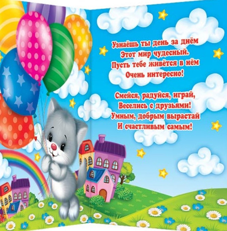 Красочная открытка с пожеланиями. В деталях указан размер в сложенном виде.